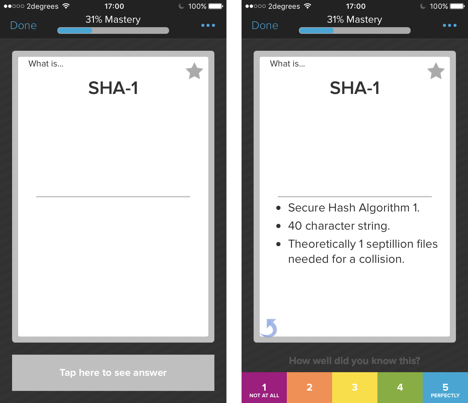 Users look at a new flashcard, and rate how well they know it, and then move onto the next. The ratings help the app to create a distribution for the repetition of knowledge so the less someone knows something the more it will appear until it becomes more well learned over time.