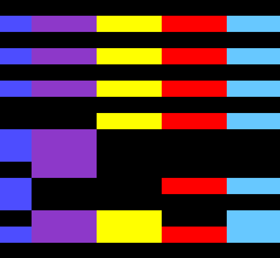 In my scripts I decided vertical spacing of wide but low-depth blocks of data would be best. I used horizontal borders to help frame the work. Colors were set randomly from a set of four which I found most pleasing.