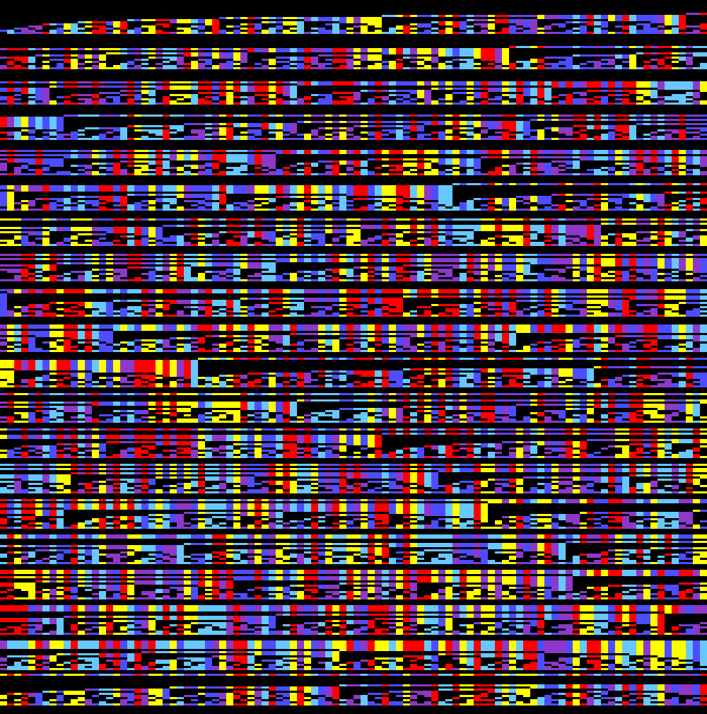 The most basic visualization I was able to imagine was to create a color pixel for each byte that is set and leave it black for each byte that isn’t set and arrange that in some meaningful way across a canvas.